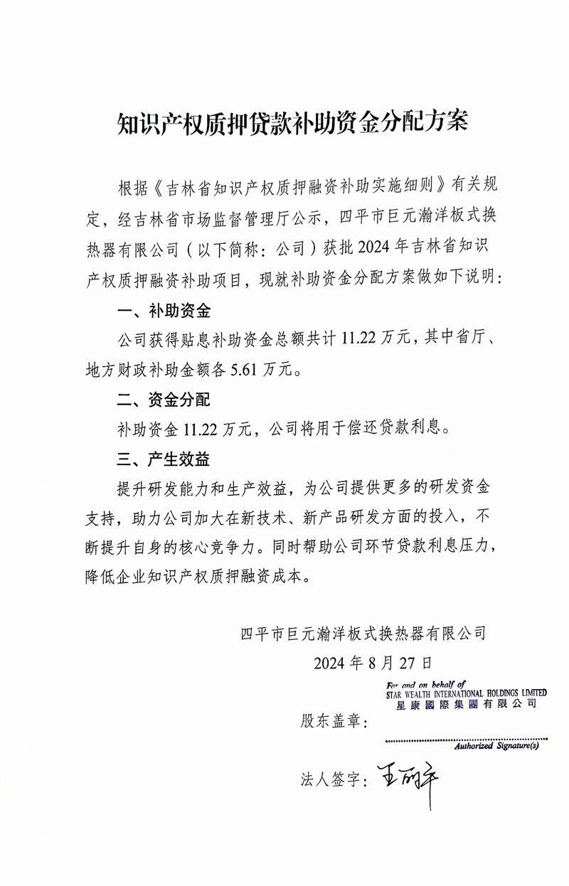 根據(jù)有關(guān)部門要求,現(xiàn)將我公司知識(shí)產(chǎn)權(quán)質(zhì)押貸款補(bǔ)助資金分配方案予以公示。公示期:2024年8月27日-9月3日,公示期內(nèi),如有問題,請(qǐng)向我公司反應(yīng),受理電話:18543436050。